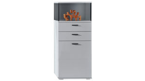 eintürige Highboard-Vitrine, nach rechts zu öffnen - mit zwei Schubladen, einem offenen Fach und einem Holzboden
