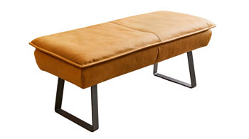 sonnengelber Lederbezug mit einer beigen Kontrastnaht und mattschwarzen Metallkufen
