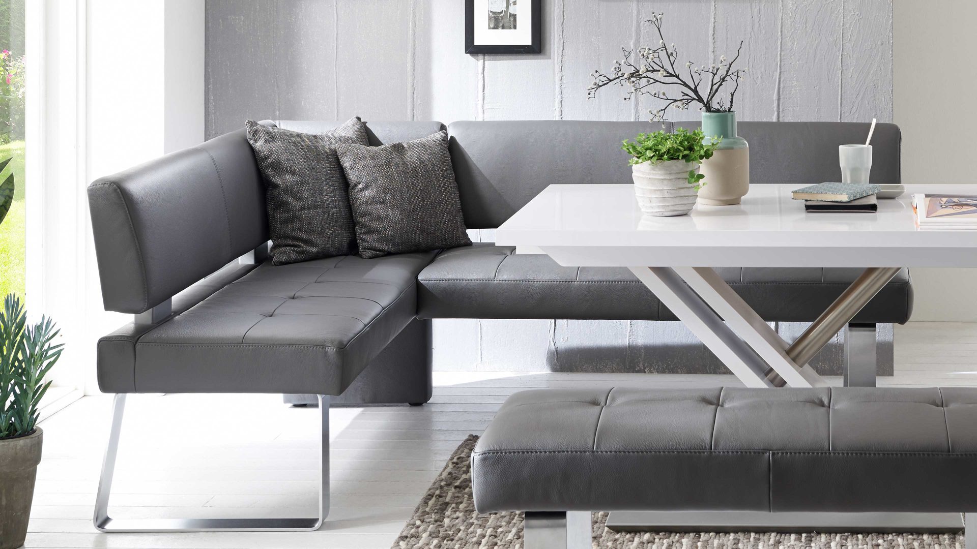 Stilvoll und elegant präsentiert sich die Dinnerbank mit einem grauen LongLife-Dicklederbezug, der sich mit den Nähten im selben Ton harmonisch in Ihre Kücheneinrichtung einfügt. Versammeln Sie Familie und Freunde um Ihren Küchentisch auf der Küchenbank, die Sie über Eck stellen und so auch ungenutzten Raum optimal ausfüllen.