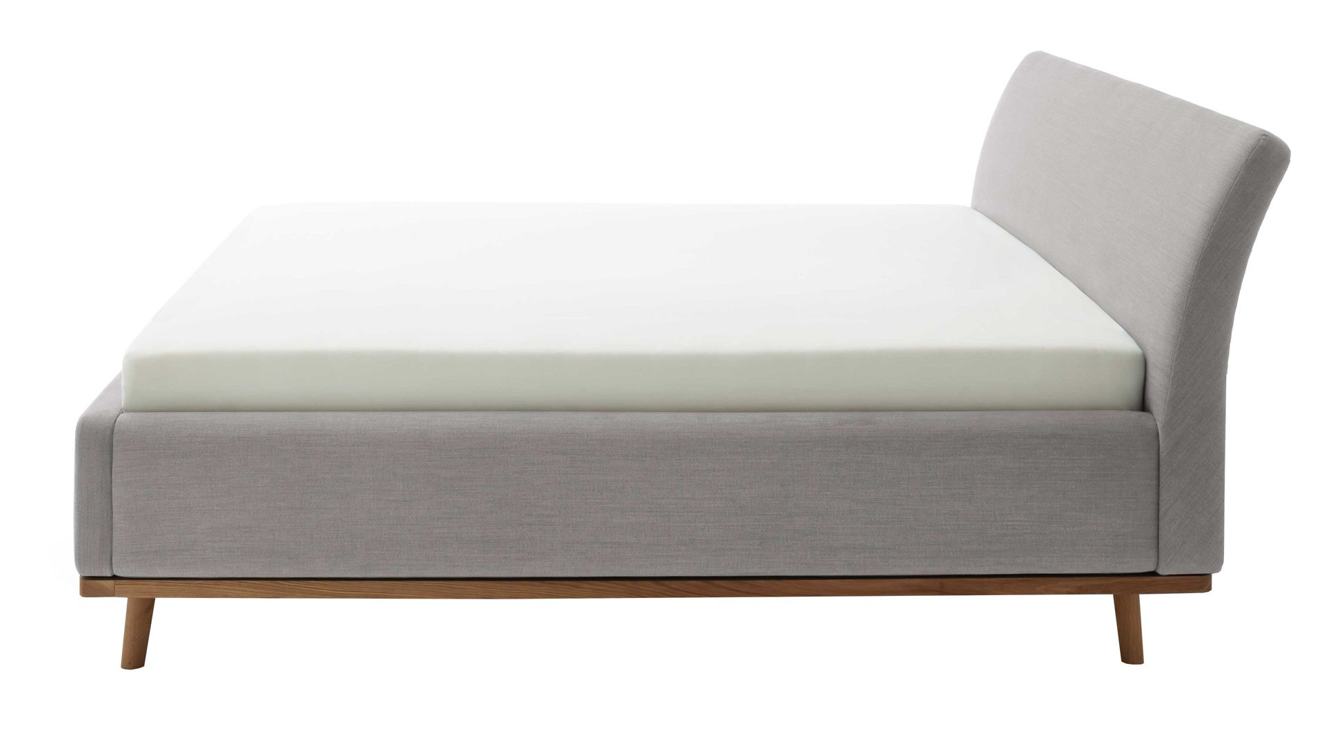 Pure Eleganz bringt das Polsterbettgestell Mila in Ihr Schlafzimmer. Es ruht auf einem eichefarbenen, massiven Holzrahmen. Die ebenfalls eichefarbenen Füße wirken filigran und verleihen diesem Modell eine luftig leichte Ausstrahlung. Ausgestattet ist das schicke Bett mit dem Bezug Capri 4150 aus hellgrauem Flachgewebe.