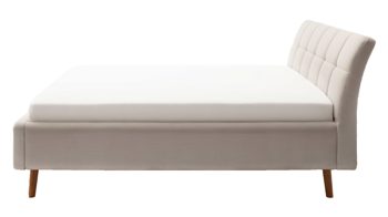 Pure Eleganz bringt das Polsterbettgestell Mila in Ihr Schlafzimmer. Die eichefarbenen Füße wirken filigran und verleihen diesem Modell eine luftig leichte Ausstrahlung. Ausgestattet ist das schicke Bett mit dem Bezug Capri 3723 aus beigem Flachgewebe.