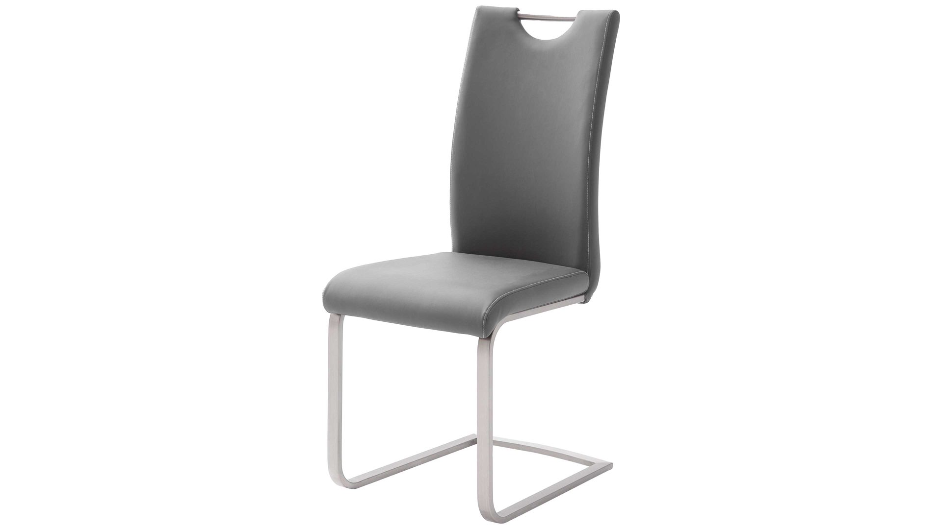 Das komfortable Sitzmöbel in Grau besticht im zeitlosen sowie geradlinigen Design und ist die perfekte Sitzgelegenheit für Ihren einladenden Essbereich. Sowohl in der Küche als auch im Esszimmer sitzen Sie und Ihre Gäste äußerst bequem auf dem Freischwinger, der mit pflegeleichtem, grauem Kunstleder und einem stabilen, gebürsteten Flachrohrgestell aus Edelstahl ein Schwingstuhl für die ganze Familie ist. Dank der praktischen Griffmulde in der Rückenlehne versetzen Sie den Polsterstuhl einfach dorthin, wo Sie ihn benötigen.