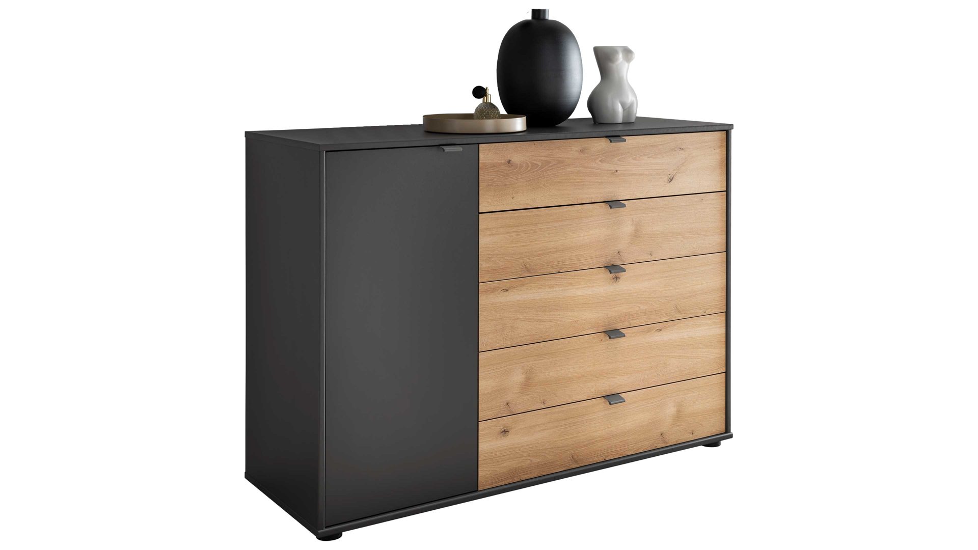 matte graphitfarbene Oberflächen, kombiniert mit biancofarbener Eiche-Nachbildung