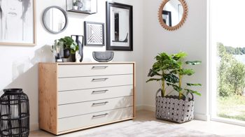 Gestaltet in hellem Echtholz-Balkeneichefurnier und weißem Mattlack, verströmt die Schubladenkommode 55006