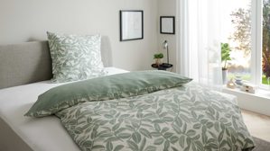 Gefertigt aus reiner Baumwolle in edler Satinbindung, bietet diese Satin-Bettwäsche einen weichen, seidigen Griff und einen dezenten Glanz. Die temperaturausgleichenden Eigenschaften sorgen für ein ausgeglichenes Schlafklima – im Sommer wie im Winter. Das Design überzeugt mit einem salbeigrünem floralen Muster auf beigem Grund auf der einen Seite und feinen Salbeigrün auf der Rückseite – für stilvolle Abwechslung im Schlafzimmer.