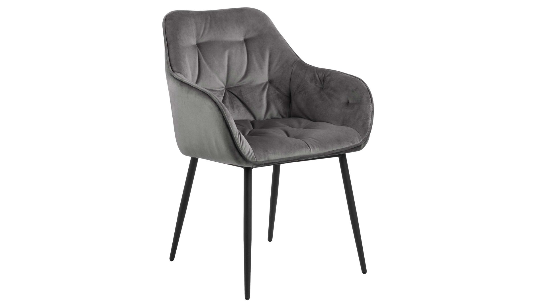 Dabei harmoniert der Polsterstuhl in seiner sanften Formensprache mit zahlreichen Einrichtungsstilen. Moderne Geradlinigkeit ergänzt er ebenso stimmig wie den beliebten Vintage-Trend. Auch farblich erlaubt der Esszimmerstuhl Brooke angenehme Freiheit beim Kombinieren: Dafür sorgt der dunkelgraue Bezug aus Samt, der die gesamte Sitzschale inklusive der bequemen Armlehnen weich umhüllt. Die rau pulverbeschichteten Metallfüße fließen in mattem Schwarz stimmig in das Gesamtbild ein.
