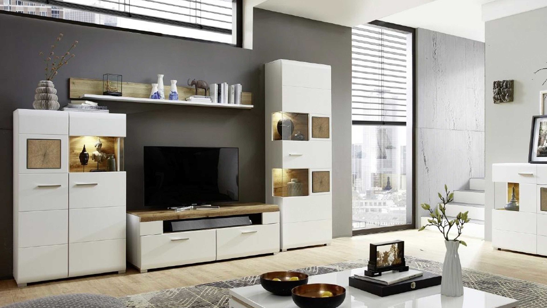 Die Wohnkombination Fun Plus lässt wirklich keine Wünsche offen. Denn die mattweißen Fronten mit Absetzungen in Hirnholz-Nachbildung wirken edel und elegant zugleich. Dabei besticht die Wohnwand durch einen mattweißen Korpus und mit einer Rückwand, Oberböden und Blenden in einer Eiche Altholz-Nachbildung. Die matt verchromten Metallgriffe und die integrierte warmweiße LED-Beleuchtung sind zudem ein weiteres Highlight. Hochwertig auch die Verarbeitung der Wohnwandkombination mit Türdämpfung sowie Schubladen mit Selbsteinzug und Softclose.