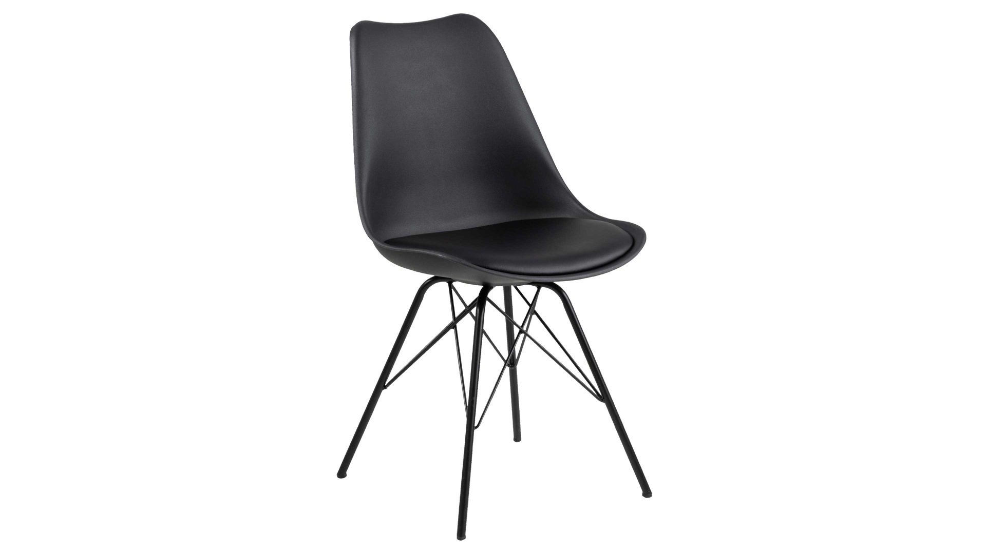 Dieser Polsterstuhl verkörpert schlichte Eleganz. Seine stabile, dabei aber wunderbar filigran designte Basis bildet ein mattschwarz pulverbeschichtetes Stahldrahtgestell. Darauf befindet sich eine schwarze Sitzschale aus robustem Kunststoff. Sie ist mit schwarzem Kunstleder bezogen, das sowohl qualitativ als auch optisch und haptisch überzeugt. Die Farbgebung sorgt für eine klassische Ausstrahlung.