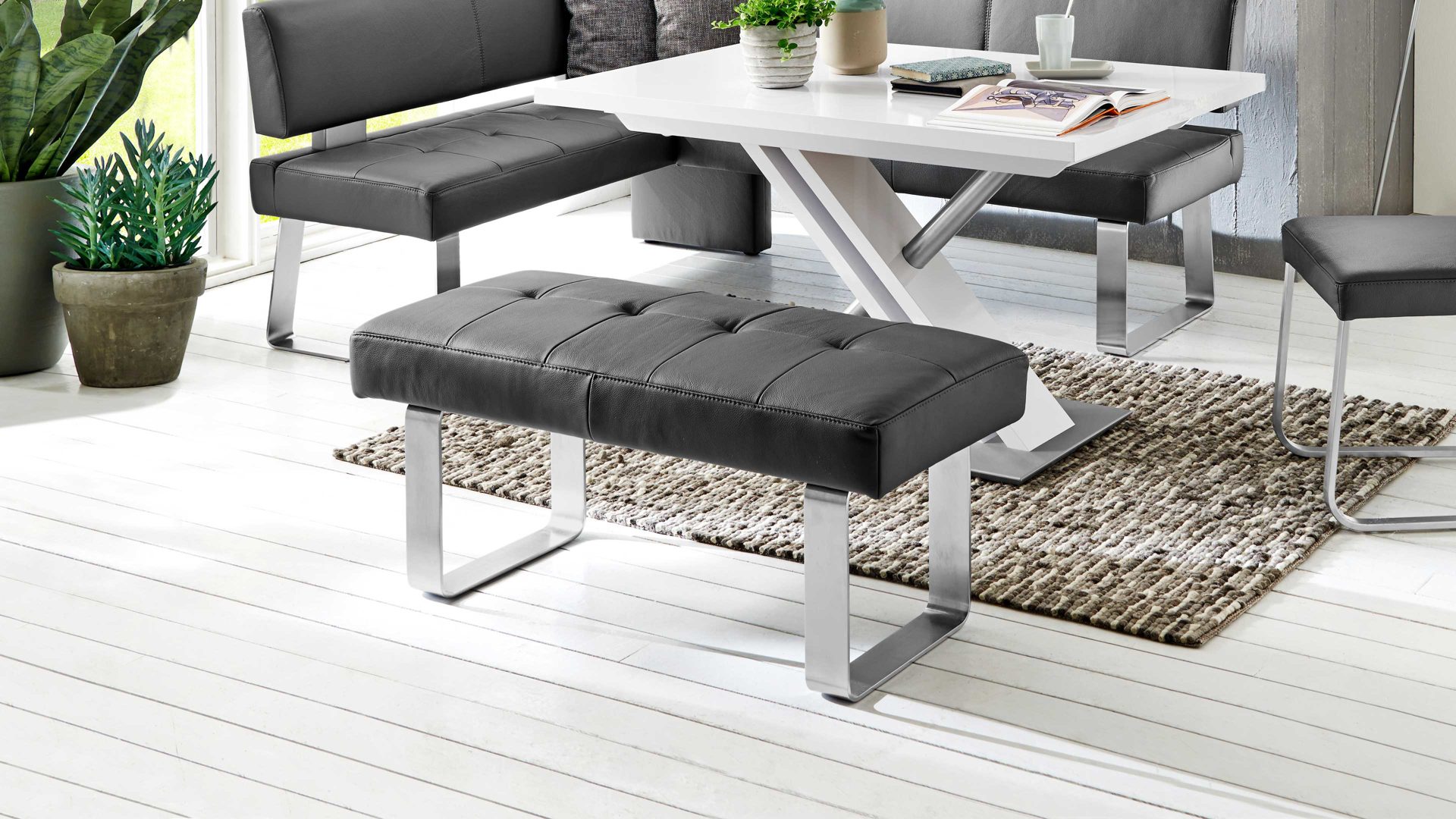 Als kompaktes Sitzmöbel leistet Ihnen die Hockerbank in der Küche oder im Esszimmer gute Dienste. Laden Sie Ihre Freunde und Familie zu einer geselligen Runde ein und genießen Sie hohen Sitzkomfort auf dieser Polsterbank, die ein echter Blickfang ist. Der Longlife-Dicklederbezug in Grau ist elegant und robust.