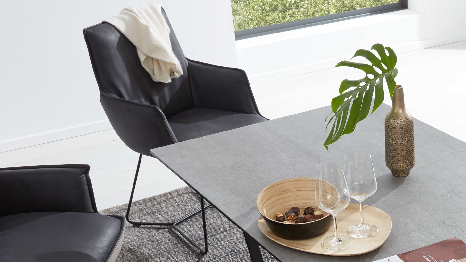 Als Basis fungiert ein mattschwarz pulverbeschichtetes Metall-Winkelgestell mit Struktur. Die Sitz- und Rückenfläche des qualitativ hochwertigen Esszimmerstuhls sind mit dunklem Leder bezogen, das extravagante Tiefgründigkeit und jede Menge Gemütlichkeit ausstrahlt.