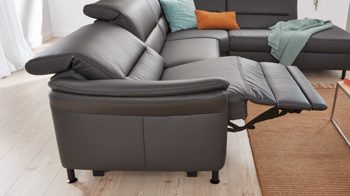 1. Zuerst fährt die Beinauflage auf Sitzhöhe. Parallel dazu bewegt sich auch der Sitz einige Zentimeter nach oben und nach vorne in eine Relaxposition. Der Rücken der Couch bleibt hierbei wandfrei.