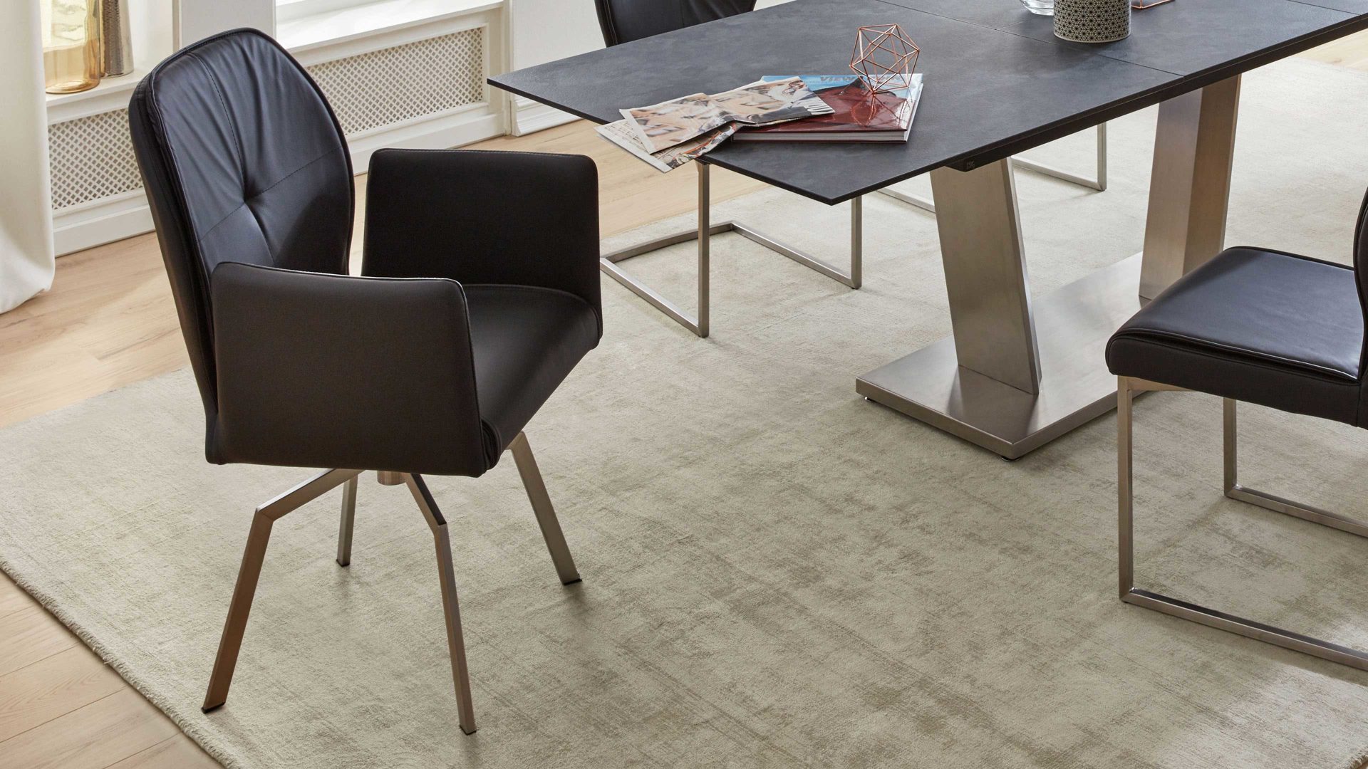 Der Armlehnstuhl X28-R-Raven-ZILVA aus der Interliving Esszimmer Serie 5104 bringt modernes Design, durchdachte Funktionalität und herausragenden Sitzkomfort perfekt in Einklang. Mit seinem edlen schwarzen Lederbezug Raven und dem gebürsteten Edelstahlgestell wird er zum stilvollen Blickfang – ob in puristischen Wohnkonzepten oder als eleganter Kontrast in klassisch eingerichteten Räumen.