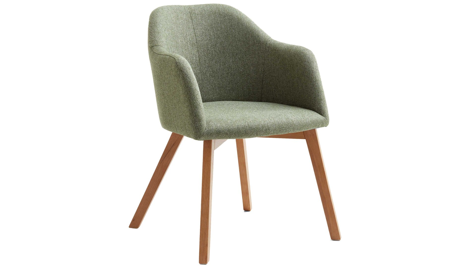 Darüber hinaus weiß er in puncto Komfort zu überzeugen. Lackierte Eichenholzfüße bilden die robuste Basis. Das natürliche Material sorgt einerseits für die nötige Stabilität und bringt andererseits ein warmes, einladendes Flair in den Raum. Attraktiv abgerundet wird der Vierfußstuhl durch den blassgrünen Webstoffbezug. Die außergewöhnliche Farbe wirkt überaus elegant und harmoniert vorzüglich mit den Holzfüßen. Einen feinen Akzent setzt die Steppnaht im Rücken des Schalensitzes.