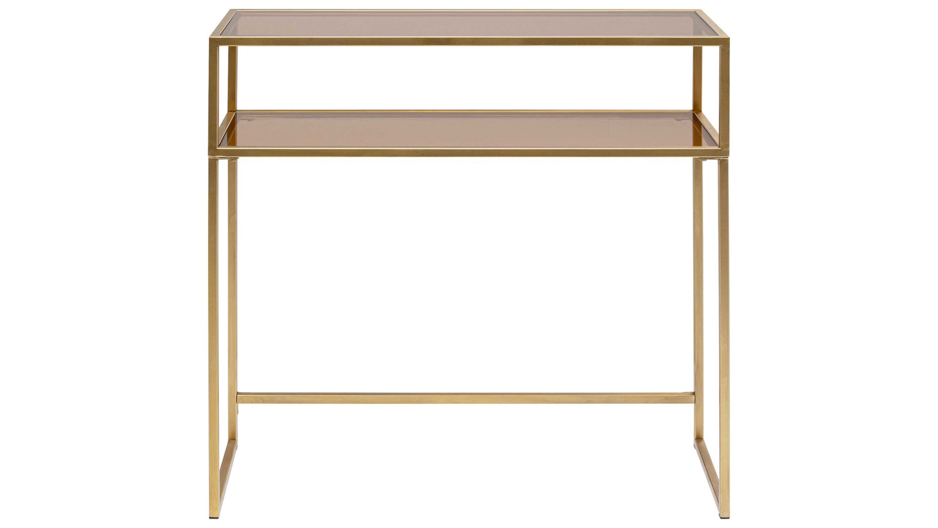 Während das Gestell aus goldfarben pulverbeschichtetem Stahl besteht, sind die zwei Böden aus bernsteinbraun gefärbtem, 5 mm starken Sicherheitsglas gefertigt. Dank der hochwertigen Materialien ist der moderne Konsolentisch enorm robust und stabil. Die Farben verleihen ihm eine betont elegante Ausstrahlung. Zudem begeistert die klare, geradlinige Formensprache.