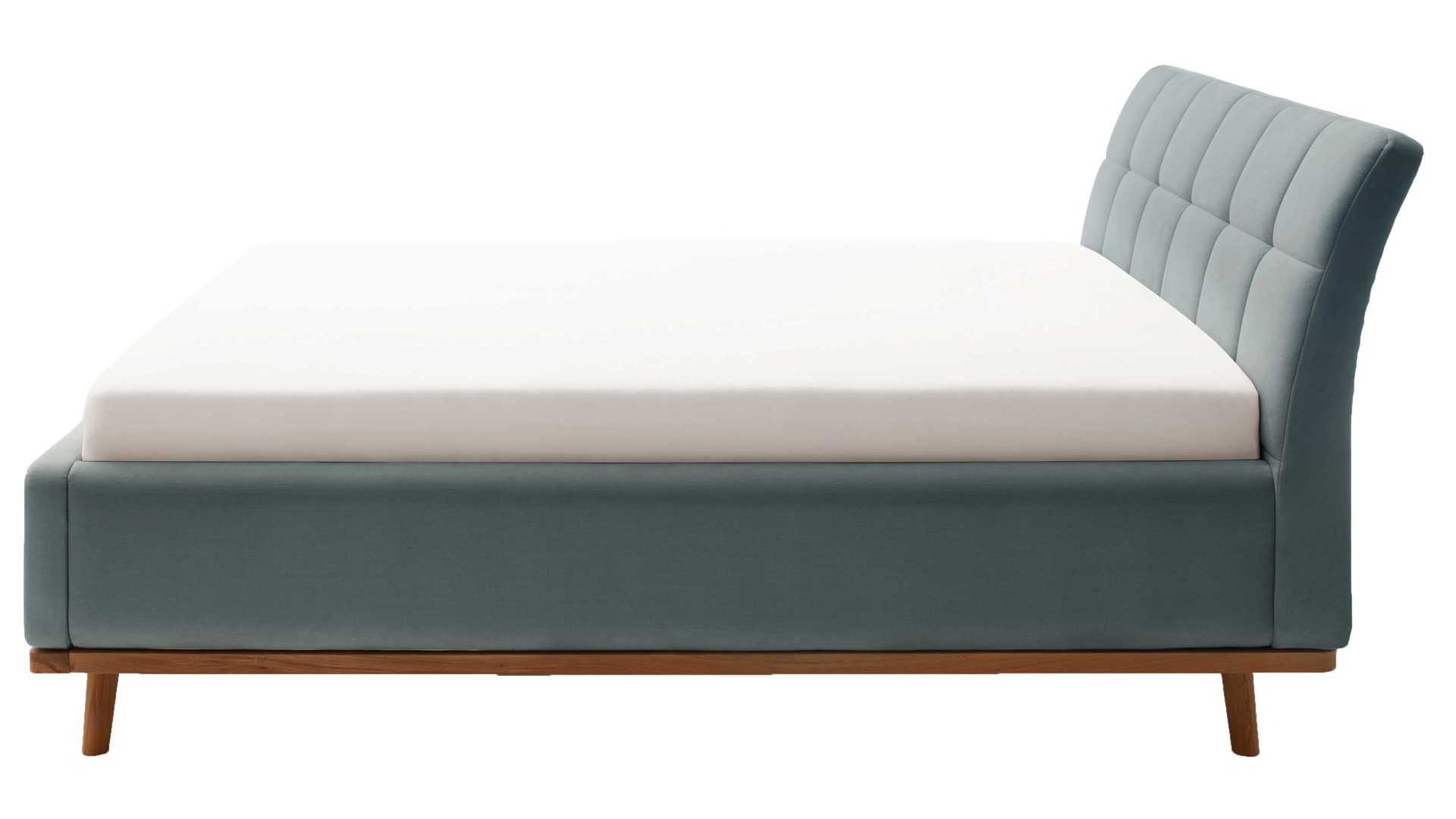 Pure Eleganz bringt das Polsterbettgestell Mila in Ihr Schlafzimmer. Es ruht auf einem eichefarbenen, massiven Holzrahmen. Die ebenfalls eichefarbenen Füße wirken filigran und verleihen diesem Modell eine luftig leichte Ausstrahlung. Ausgestattet ist das schicke Bett mit dem Bezug Capri 7463 aus Flachgewebe in der Farbe Ocean.