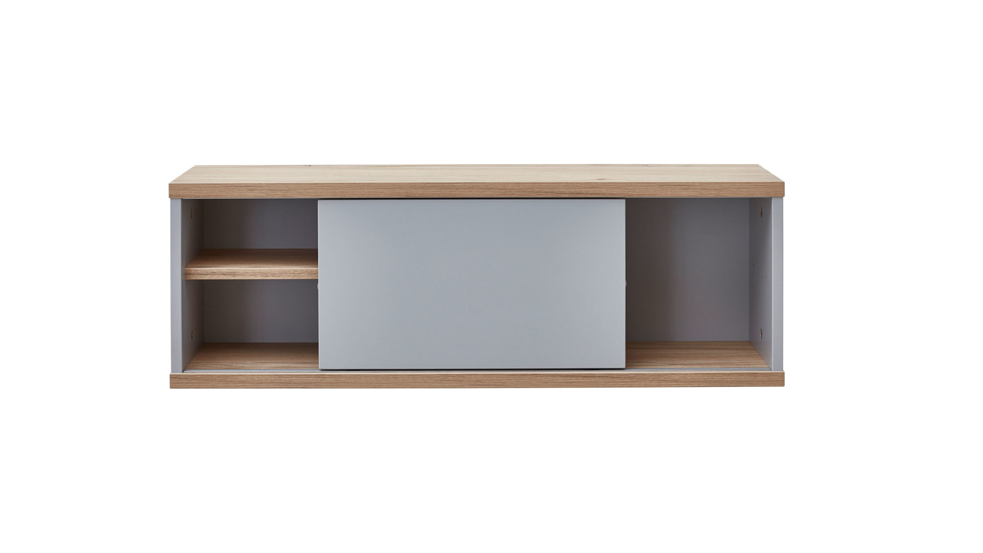 Funktional überzeugt das erstklassig verarbeitete Regal mit einem großen Fach rechts sowie einem durch einen Einlegeboden unterteilten Bereich linksseitig. Die praktische Schiebetür lässt sich komplett von links nach rechts durchschieben. Es steht demnach offener und halbgeschlossener Stauraum für verschiedene Gegenstände zur Verfügung, etwa Spielsachen, Bücher und Zeitschriften, Fotoalben, CDs, DVDs und Blu-Rays oder andere Utensilien, die entweder vor Licht und Staub geschützt oder dekorativ sichtbar aufbewahrt werden sollen. Auf ca. 86 x 29 x 20 cm (BxHxL) belaufen sich die Maße des praktischen Regalelements.