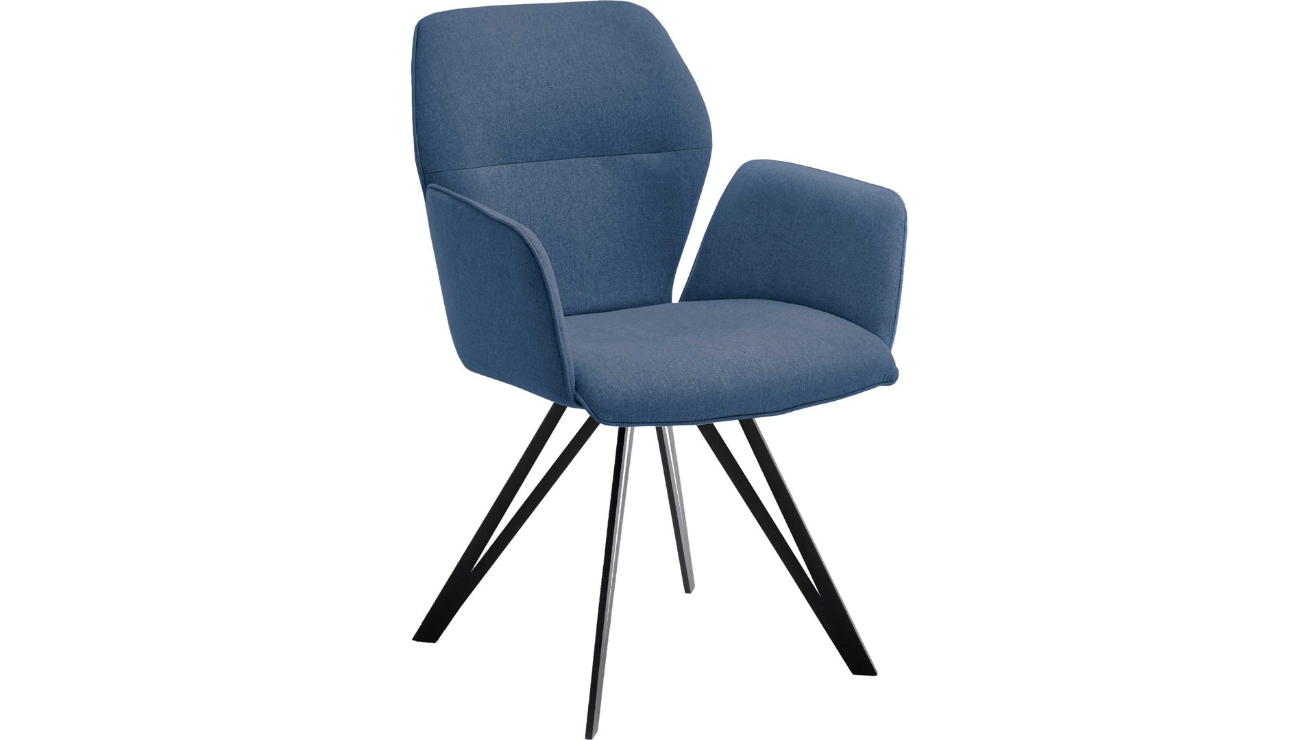 Er kombiniert einen blauen Webstoffbezug mit einem schwarz pulverbeschichteten Vierfuß-Flachstahlgestell. Letzteres sorgt für eine stabile Basis sowie für puristisch-elegantes Flair im Esszimmer. Dazu trägt auch der tiefe Farbton des hochwertigen, angenehm weichen Stoffbezugs bei. Überdies unterstreicht die spezielle Formensprache des Gestells die originelle Ausstrahlung des Vierfußstuhls.
