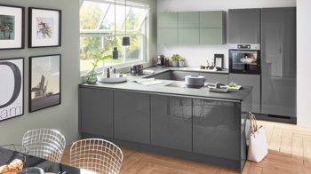 Die nobilia® Einbauküche Flash kombiniert die eindrucksvolle Eleganz von hochglänzendem Schiefergrau mit Akzenten in mattem Schilf.