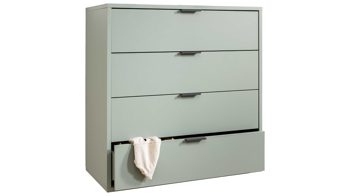 Die stabile Kommode ist mit vier Schubladen ausgestattet, die Ihnen beispielsweise Stauraum für Wäsche bieten und durch die Softclose-Funktion sanft und leise schließen. Auf dem Oberboden haben Sie Platz für eine Lampe und auch andere Deko. Die Maße des Kommodenschranks betragen ca. 81 x 87 x 45 cm (BxHxT).