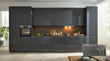 Ein graphitfarbener Korpus, glänzende graphitfarbene Sockelblenden und manganbronzefarbene Griffleisten runden das modern-elegante Design harmonisch ab.