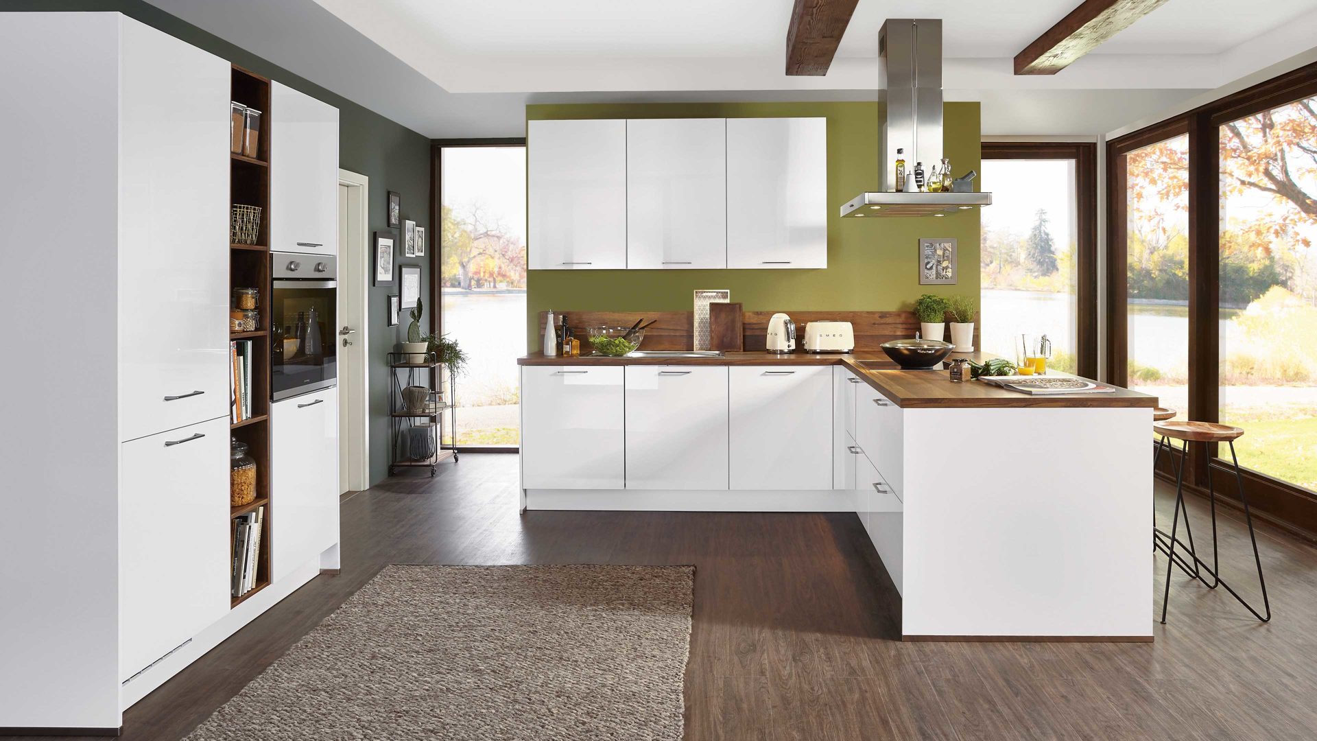 Freuen Sie sich auf entspanntes Kochen und Backen in der alpinweißen nobilia® Einbauküche Focus in L-Form mit Hochschrankkombination und inklusive privileg Elektrogeräten.