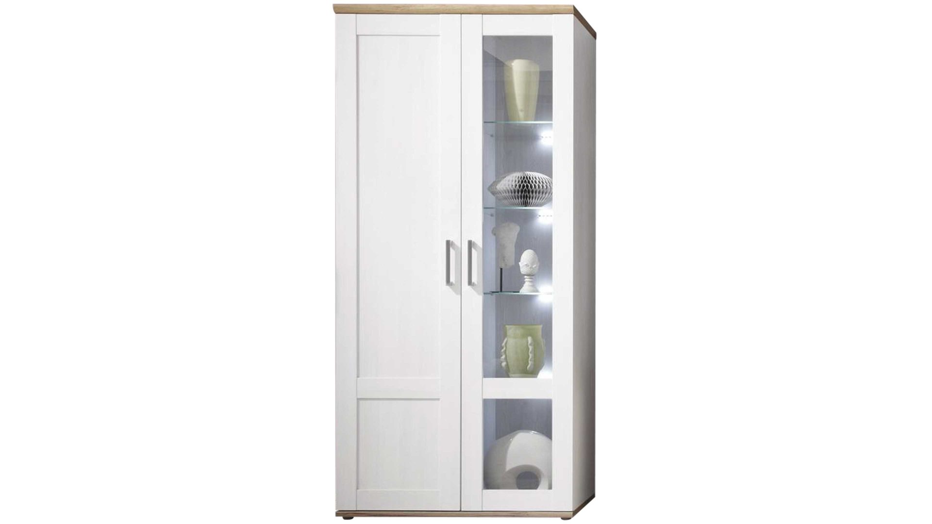 Nutzen Sie diesen Vitrinenschrank, um schönes Geschirr, edle Weingläser oder dekorative Wohnaccessoires geschmackvoll zu präsentieren. Sein Korpus aus Sibiu Lärche-Nachbildung sowie hellen San Remo Kunststoffoberflächen strahlt Ruhe und Behaglichkeit aus. Neben einer Holztür, hinter der sich vier Holzböden verstecken, verfügt die Vitrine auch über eine Glastür. Diese gibt den Blick auf vier Glasböden mit kaltweißer LED-Beleuchtung frei.
