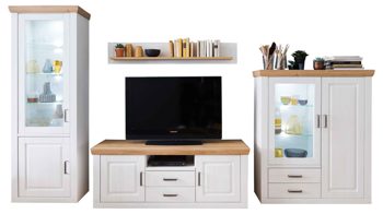 Die vierteilige Wohnkombination besteht aus einer Standvitrine, einem Lowboard, einem Wandboard und einer Highboard-Vitrine. Hier die wichtigsten Eigenschaften der einzelnen Wohnmöbel im Überblick: