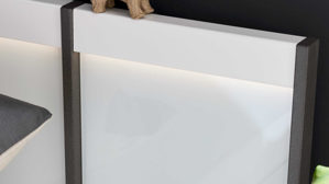 Für mehr Stauraum stehen zwei Nachtkonsolenvarianten in 60 cm Breite zur Auswahl – mit einem oder drei Auszügen. Passende Aufsatzpaneele lassen sich ebenfalls mit LED-Beleuchtung kombinieren. Ergänzt wird das Programm durch hochwertige, vormontierte Beimöbel.