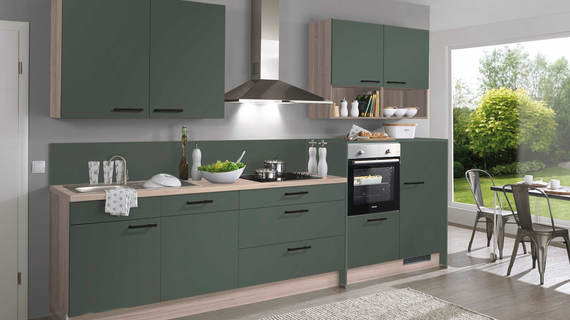 Küchenzeile inklusive Nischenverkleidung, hochwertiger Edelstahl-Einbauspüle und mit hochgebautem Backofen, Länge ca. 343 cm