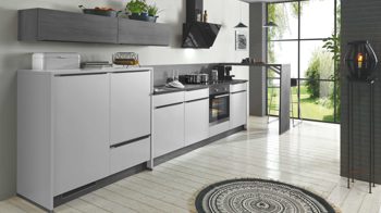 matte hellgraue Lacklaminatfronten, kombiniert mit grauer Eiche-Nachbildung