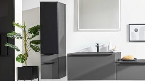 Nutze den Hängeschrank als platzsparende Stauraumlösung in kleineren Badezimmern. Kombiniere ihn mit weiteren Schrankelementen wie Unterschränken oder Waschtischunterschrank, um noch mehr Ordnung zu schaffen. Setze Kontraste: Die matte schiefergraue Oberfläche harmoniert besonders gut mit hellen Fliesen oder Holzoptik.