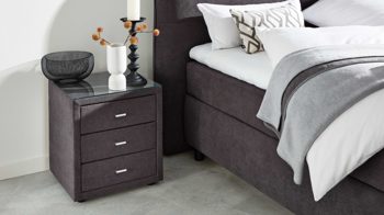 Die Nachtkommode aus der Interliving Bettsystem Serie 1414 bringt mit ihrem dunkelgrauen Stoffbezug moderne Eleganz und eine harmonische Optik in Ihr Schlafzimmer. Matte aluminiumfarbene Griffe und schwarze Kunststofffüße runden das Design stilvoll ab – perfekt als funktionales und zugleich ästhetisches Beimöbel zu Ihrem Komfortbett.